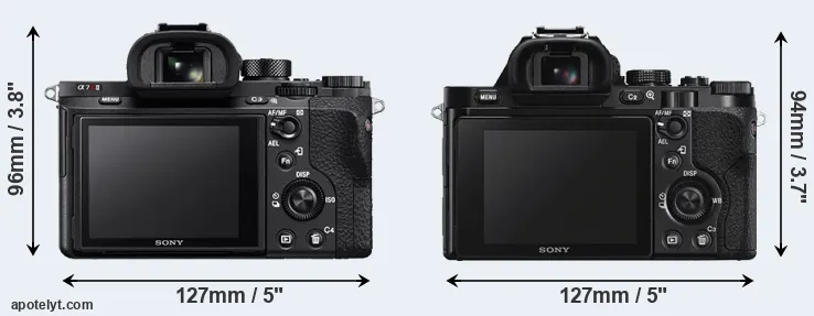 The physical size and weight of the Sony A7R II and the Sony A7S are illustrated in the side-by-side display below. The two cameras are presented according to their relative size. Three consecutive views from the front, the top, and the rear side are shown. All width, height and depth measures are rounded to the nearest millimeter.