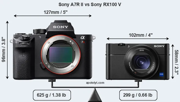 An illustration of the physical size and weight of the Sony A7R II and the Sony RX100 V is provided in the side-by-side display below. The two cameras are presented according to their relative size. Three successive views from the front, the top, and the rear are shown. All width, height and depth measures are rounded to the nearest millimeter.