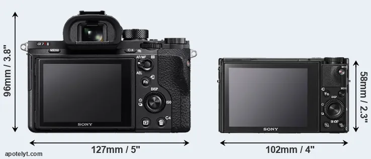 If the front view area (width x height) of the cameras is taken as an aggregate measure of their size, the Sony RX100 V is considerably smaller (51 percent) than the Sony A7R II. It is worth mentioning in this context that the A7R II is splash and dust resistant, while the RX100 V does not feature any corresponding weather-sealing.