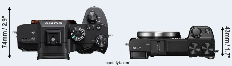 The physical size and weight of the Sony A7R III and the Sony NEX-7 are illustrated in the side-by-side display below. The two cameras are presented according to their relative size. Three consecutive views from the front, the top, and the rear side are shown. All size dimensions are rounded to the nearest millimeter.