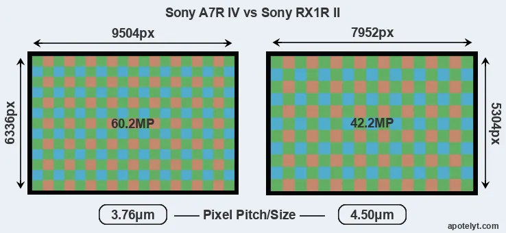 Despite having a slightly smaller sensor, the Sony A7R IV offers a higher resolution of 60.2 megapixels, compared with 42.2 MP of the Sony RX1R II. This megapixels advantage comes at the cost of a higher pixel density and a smaller size of the individual pixel (with a pixel pitch of 3.76μm versus 4.50μm for the RX1R II). However, it should be noted that the A7R IV is much more recent (by 3 years and 9 months) than the RX1R II, and its sensor will have benefitted from technological advances during this time that make it possible to gather light more efficiently. Coming back to sensor resolution, it should be mentioned that neither of the two cameras has an anti-alias filter installed, so they are able to capture all the detail the sensor resolves.