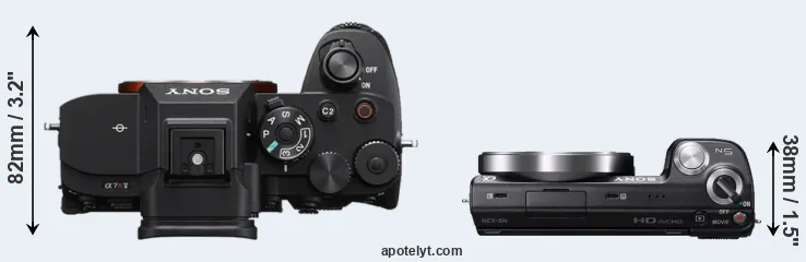 The side-by-side display below illustrates the physical size and weight of the Sony A7R V and the Sony NEX-5N. The two cameras are presented according to their relative size. Three consecutive perspectives from the front, the top, and the back are available. All width, height and depth measures are rounded to the nearest millimeter.