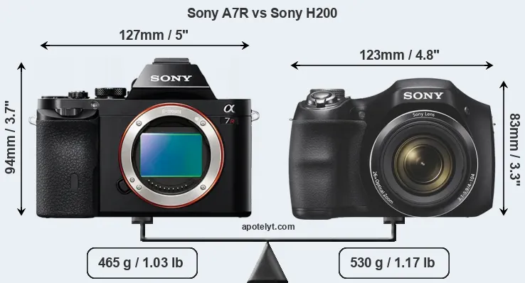 An illustration of the physical size and weight of the Sony A7R and the Sony H200 is provided in the side-by-side display below. The two cameras are presented according to their relative size. Three consecutive views from the front, the top, and the rear side are shown. All width, height and depth measures are rounded to the nearest millimeter.