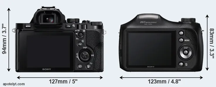 The Sony Alpha A7R and the Sony Cyber-shot DSC-H200 are two digital cameras that were revealed to the public, respectively, in October 2013 and January 2013. The A7R is a mirrorless interchangeable lens camera, while the H200 is a fixed lens compact. The cameras are based on a full frame (A7R) and a 1/2.3-inch (H200) sensor. The A7R has a resolution of 36.2 megapixels, whereas the H200 provides 15.2 MP.