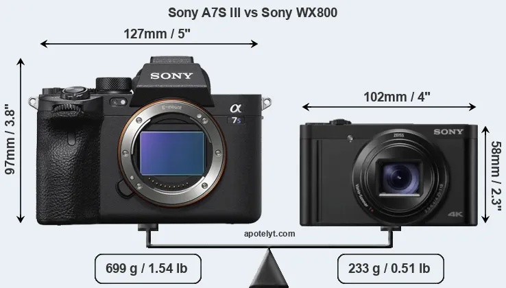 The above size and weight comparisons are to some extent incomplete and possibly misleading, as the WX800 has a lens built in, whereas the A7S III is an interchangeable lens camera that requires a separate lens. Attaching the latter will add extra weight and bulk to the setup. You can compare the optics available for the A7S III and their specifications in the Sony FE Lens Catalog.