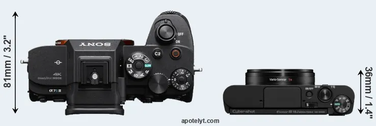 The side-by-side display below illustrates the physical size and weight of the Sony A7S III and the Sony WX800. The two cameras are presented according to their relative size. Three successive views from the front, the top, and the rear are shown. All size dimensions are rounded to the nearest millimeter.