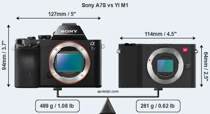 If the front view area (width x height) of the cameras is taken as an aggregate measure of their size, the YI M1 is considerably smaller (39 percent) than the Sony A7S. Moreover, the M1 is substantially lighter (43 percent) than the A7S. It is worth mentioning in this context that the A7S is splash and dust resistant, while the M1 does not feature any corresponding weather-sealing.
