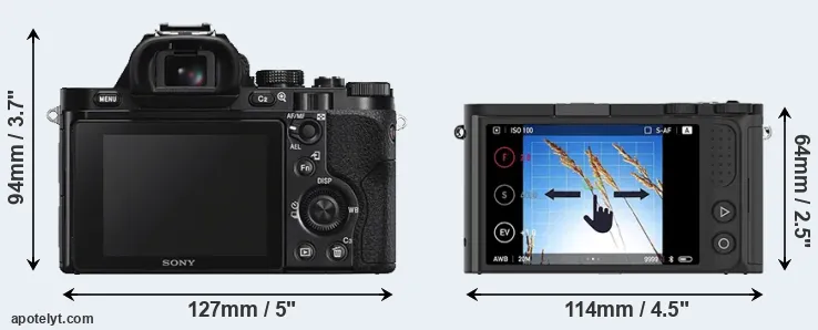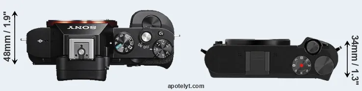 An illustration of the physical size and weight of the Sony A7S and the YI M1 is provided in the side-by-side display below. The two cameras are presented according to their relative size. Three successive views from the front, the top, and the rear are shown. All width, height and depth dimensions are rounded to the nearest millimeter.
