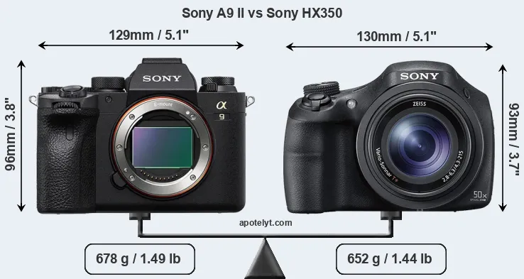 The physical size and weight of the Sony A9 II and the Sony HX350 are illustrated in the side-by-side display below. The two cameras are presented according to their relative size. Three consecutive perspectives from the front, the top, and the back are available. All size dimensions are rounded to the nearest millimeter.