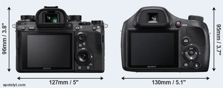 If the front view area (width x height) of the cameras is taken as an aggregate measure of their size, the Sony H400 is somewhat larger (1 percent) than the Sony A9. It is worth mentioning in this context that the A9 is splash and dust resistant, while the H400 does not feature any corresponding weather-sealing.