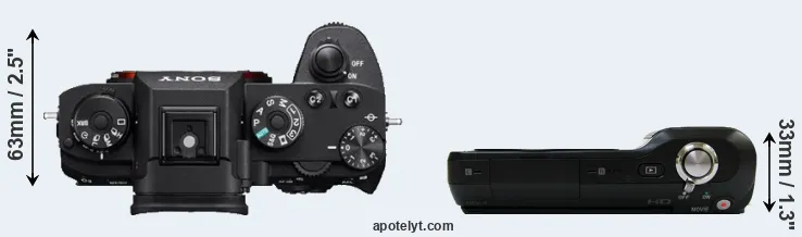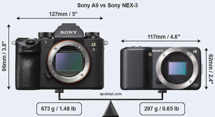 The side-by-side display below illustrates the physical size and weight of the Sony A9 and the Sony NEX-3. The two cameras are presented according to their relative size. Three consecutive views from the front, the top, and the rear side are shown. All width, height and depth dimensions are rounded to the nearest millimeter.