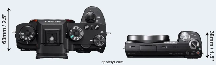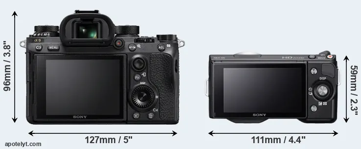 The physical size and weight of the Sony A9 and the Sony NEX-5N are illustrated in the side-by-side display below. The two cameras are presented according to their relative size. Three consecutive views from the front, the top, and the rear side are shown. All size dimensions are rounded to the nearest millimeter.