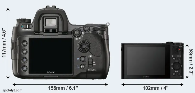The side-by-side display below illustrates the physical size and weight of the Sony A900 and the Sony HX90V. The two cameras are presented according to their relative size. Three consecutive views from the front, the top, and the rear side are shown. All width, height and depth measures are rounded to the nearest millimeter.