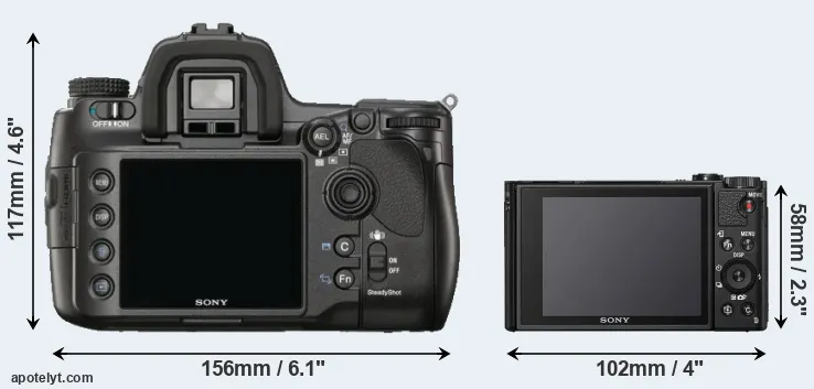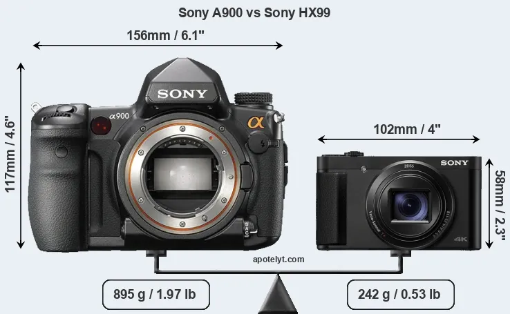 The side-by-side display below illustrates the physical size and weight of the Sony A900 and the Sony HX99. The two cameras are presented according to their relative size. Three consecutive views from the front, the top, and the rear side are shown. All width, height and depth measures are rounded to the nearest millimeter.