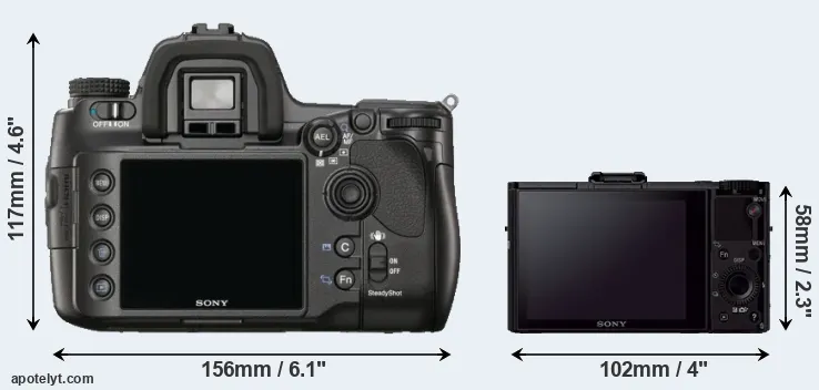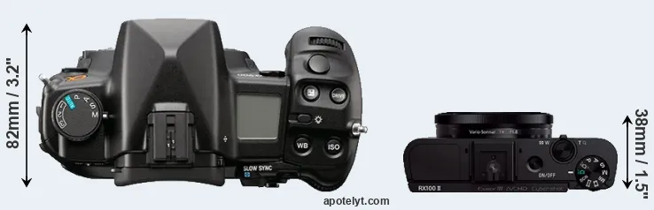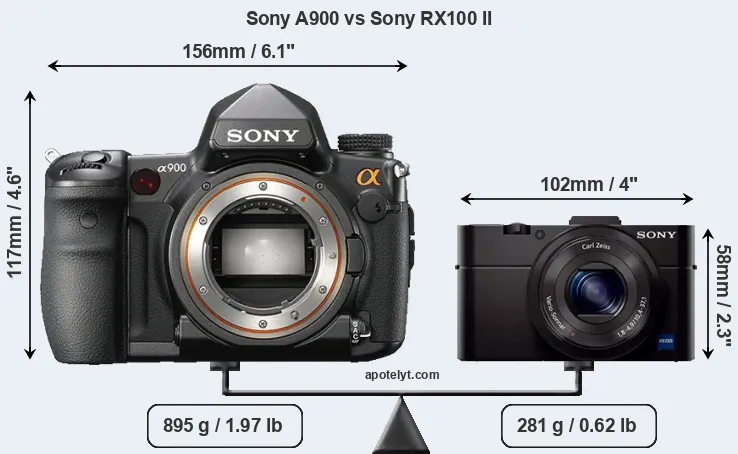 The side-by-side display below illustrates the physical size and weight of the Sony A900 and the Sony RX100 II. The two cameras are presented according to their relative size. Three consecutive perspectives from the front, the top, and the back are available. All width, height and depth measures are rounded to the nearest millimeter.