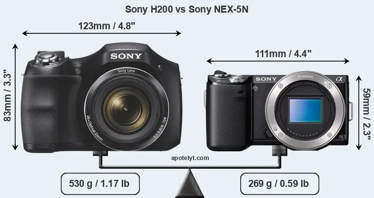 The physical size and weight of the Sony H200 and the Sony NEX-5N are illustrated in the side-by-side display below. The two cameras are presented according to their relative size. Three consecutive perspectives from the front, the top, and the back are available. All width, height and depth dimensions are rounded to the nearest millimeter.
