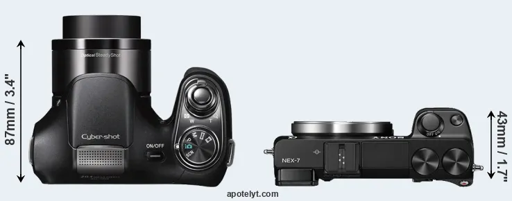 The physical size and weight of the Sony H200 and the Sony NEX-7 are illustrated in the side-by-side display below. The two cameras are presented according to their relative size. Three consecutive perspectives from the front, the top, and the back are available. All width, height and depth dimensions are rounded to the nearest millimeter.