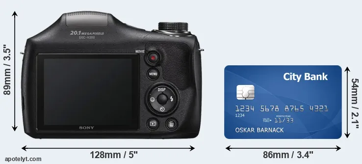 An illustration of the physical dimensions of the Sony H300 vis-à-vis a credit card is provided in the side-by-side display below. Three consecutive views from the front, the top, and the rear side are shown. All width, height and depth measures are rounded to the nearest millimeter.