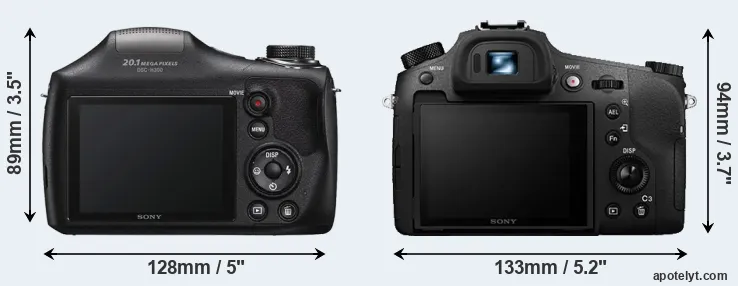 An illustration of the physical size and weight of the Sony H300 and the Sony RX10 III is provided in the side-by-side display below. The two cameras are presented according to their relative size. Three consecutive perspectives from the front, the top, and the back are available. All size dimensions are rounded to the nearest millimeter.