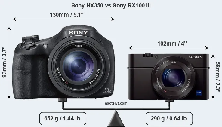 If the front view area (width x height) of the cameras is taken as an aggregate measure of their size, the Sony RX100 III is considerably smaller (51 percent) than the Sony HX350. Moreover, the RX100 III is substantially lighter (56 percent) than the HX350. In this context, it is worth noting that neither the HX350 nor the RX100 III are weather-sealed.