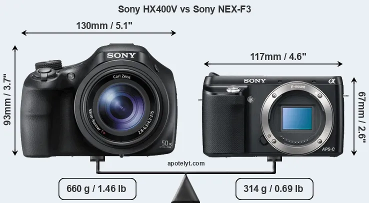 The side-by-side display below illustrates the physical size and weight of the Sony HX400V and the Sony NEX-F3. The two cameras are presented according to their relative size. Three consecutive perspectives from the front, the top, and the back are available. All width, height and depth measures are rounded to the nearest millimeter.