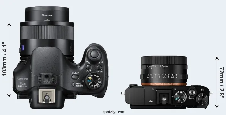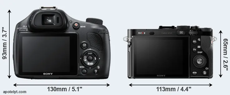 The side-by-side display below illustrates the physical size and weight of the Sony HX400V and the Sony RX1R II. The two cameras are presented according to their relative size. Three consecutive perspectives from the front, the top, and the back are available. All width, height and depth dimensions are rounded to the nearest millimeter.