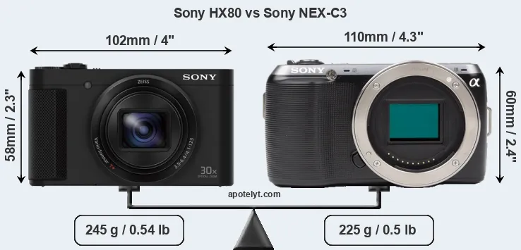 The physical size and weight of the Sony HX80 and the Sony NEX-C3 are illustrated in the side-by-side display below. The two cameras are presented according to their relative size. Three consecutive perspectives from the front, the top, and the back are available. All width, height and depth measures are rounded to the nearest millimeter.