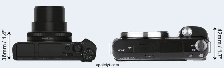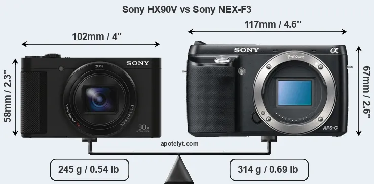 An illustration of the physical size and weight of the Sony HX90V and the Sony NEX-F3 is provided in the side-by-side display below. The two cameras are presented according to their relative size. Three consecutive views from the front, the top, and the rear side are shown. All width, height and depth measures are rounded to the nearest millimeter.