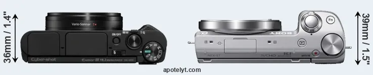 The physical size and weight of the Sony HX95 and the Sony NEX-5T are illustrated in the side-by-side display below. The two cameras are presented according to their relative size. Three successive views from the front, the top, and the rear are shown. All size dimensions are rounded to the nearest millimeter.