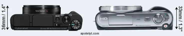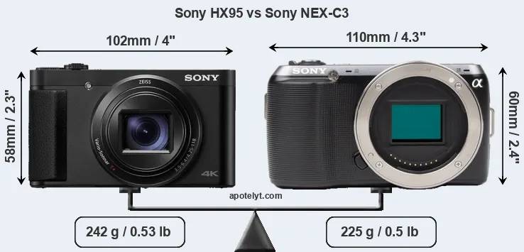 The side-by-side display below illustrates the physical size and weight of the Sony HX95 and the Sony NEX-C3. The two cameras are presented according to their relative size. Three consecutive perspectives from the front, the top, and the back are available. All width, height and depth measures are rounded to the nearest millimeter.