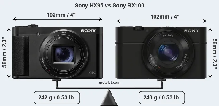 An illustration of the physical size and weight of the Sony HX95 and the Sony RX100 is provided in the side-by-side display below. The two cameras are presented according to their relative size. Three successive views from the front, the top, and the rear are shown. All size dimensions are rounded to the nearest millimeter.