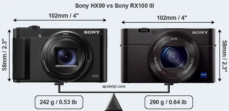 An illustration of the physical size and weight of the Sony HX99 and the Sony RX100 III is provided in the side-by-side display below. The two cameras are presented according to their relative size. Three successive views from the front, the top, and the rear are shown. All width, height and depth dimensions are rounded to the nearest millimeter.