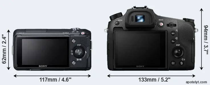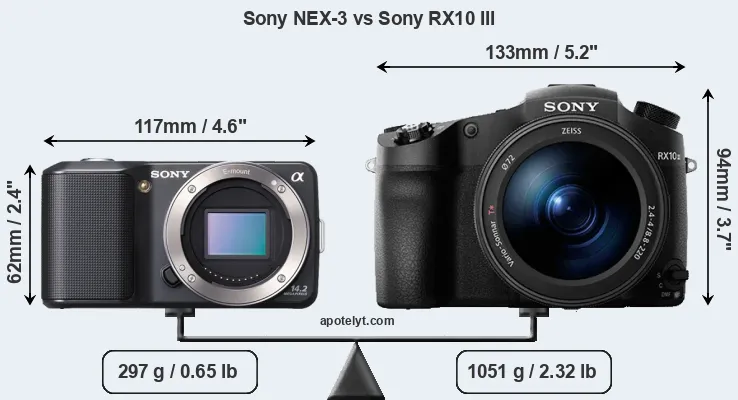 If the front view area (width x height) of the cameras is taken as an aggregate measure of their size, the Sony RX10 III is considerably larger (72 percent) than the Sony NEX-3. It is noteworthy in this context that the RX10 III is splash and dust-proof, while the NEX-3 does not feature any corresponding weather-sealing.