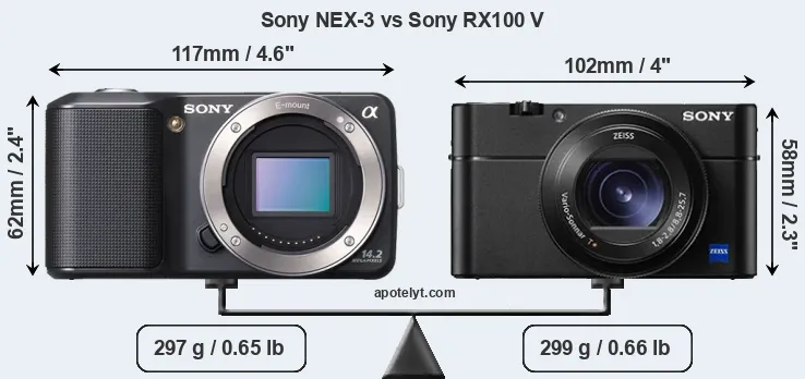 The side-by-side display below illustrates the physical size and weight of the Sony NEX-3 and the Sony RX100 V. The two cameras are presented according to their relative size. Three consecutive views from the front, the top, and the rear side are shown. All size dimensions are rounded to the nearest millimeter.