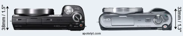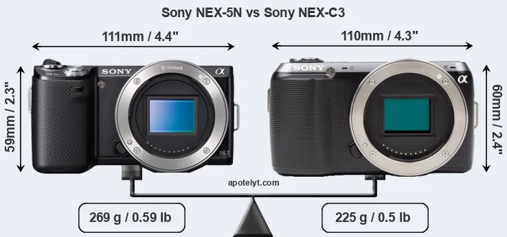 An illustration of the physical size and weight of the Sony NEX-5N and the Sony NEX-C3 is provided in the side-by-side display below. The two cameras are presented according to their relative size. Three consecutive perspectives from the front, the top, and the back are available. All width, height and depth dimensions are rounded to the nearest millimeter.
