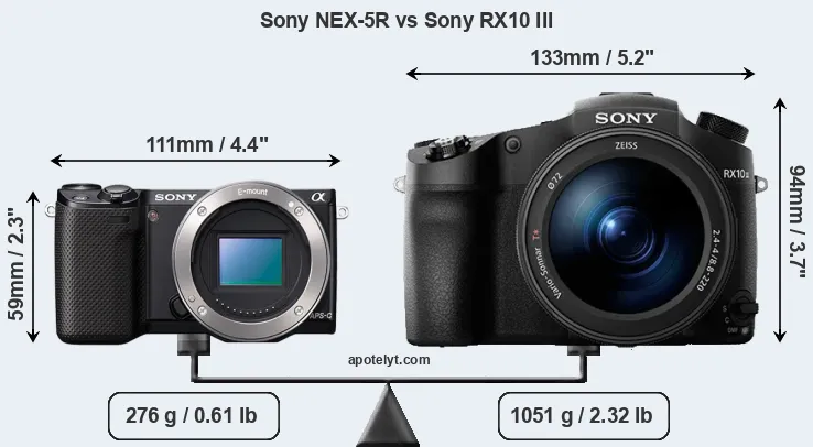The above size and weight comparisons are to some extent incomplete and possibly misleading, as the RX10 III has a lens built in, whereas the NEX-5R is an interchangeable lens camera that requires a separate lens. Attaching the latter will add extra weight and bulk to the setup. You can compare the optics available for the NEX-5R and their specifications in the Sony E-Mount Lens Catalog.