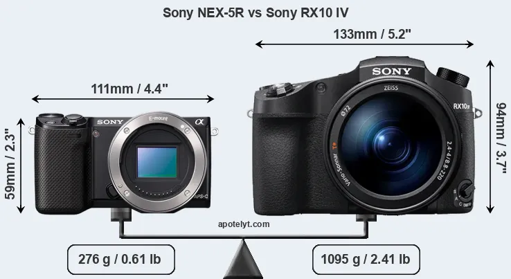 If the front view area (width x height) of the cameras is taken as an aggregate measure of their size, the Sony RX10 IV is considerably larger (91 percent) than the Sony NEX-5R. It is noteworthy in this context that the RX10 IV is splash and dust-proof, while the NEX-5R does not feature any corresponding weather-sealing.