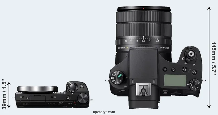 The above size and weight comparisons are to some extent incomplete and possibly misleading, as the RX10 IV has a lens built in, whereas the NEX-5R is an interchangeable lens camera that requires a separate lens. Attaching the latter will add extra weight and bulk to the setup. You can compare the optics available for the NEX-5R and their specifications in the Sony E-Mount Lens Catalog.