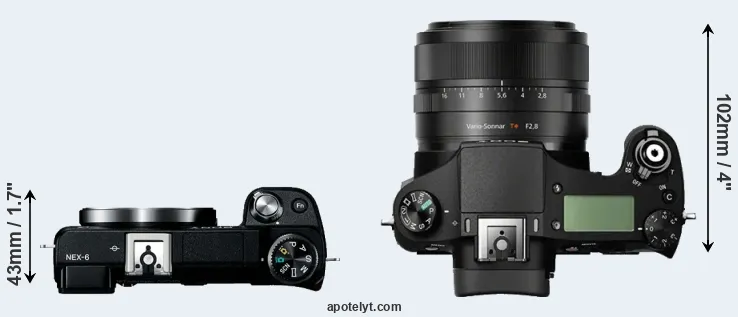 The side-by-side display below illustrates the physical size and weight of the Sony NEX-6 and the Sony RX10. The two cameras are presented according to their relative size. Three consecutive views from the front, the top, and the rear side are shown. All width, height and depth dimensions are rounded to the nearest millimeter.