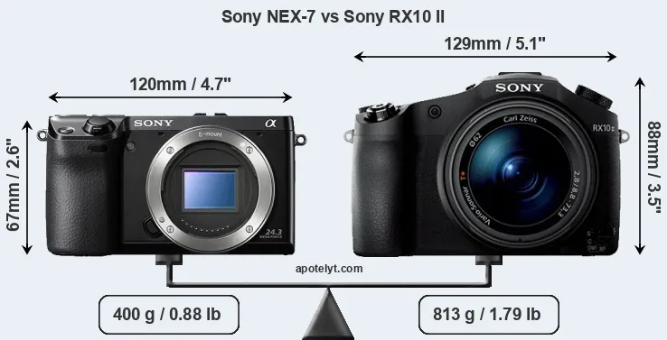 If the front view area (width x height) of the cameras is taken as an aggregate measure of their size, the Sony RX10 II is notably larger (41 percent) than the Sony NEX-7. It is noteworthy in this context that the RX10 II is splash and dust-proof, while the NEX-7 does not feature any corresponding weather-sealing.
