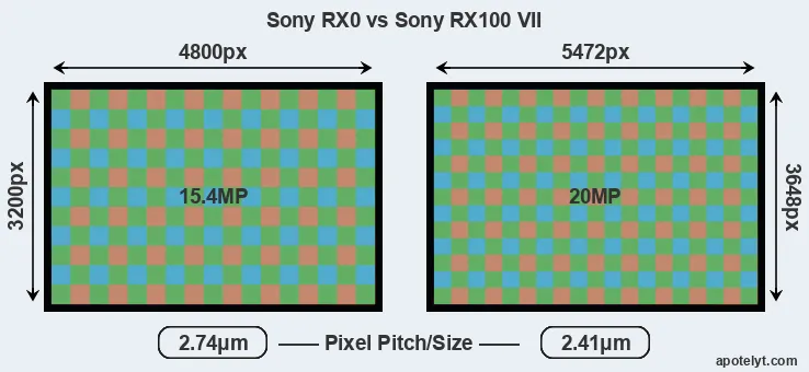 While the two cameras under review share the same sensor size, the RX100 VII offers a higher resolution of 20 megapixels, compared with 15.4 MP of the RX0. This megapixels advantage translates into a 14 percent gain in linear resolution. On the other hand, these sensor specs imply that the RX100 VII has a higher pixel density and a smaller size of the individual pixel (with a pixel pitch of 2.41μm versus 2.74μm for the RX0). However, it should be noted that the RX100 VII is a somewhat more recent model (by 1 year and 10 months) than the RX0, and its sensor might have benefitted from technological advances during this time that at least partly compensate for the smaller pixel size.
