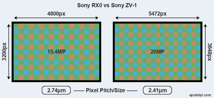 While the two cameras under review share the same sensor size, the ZV-1 offers a higher resolution of 20 megapixels, compared with 15.4 MP of the RX0. This megapixels advantage translates into a 14 percent gain in linear resolution. On the other hand, these sensor specs imply that the ZV-1 has a higher pixel density and a smaller size of the individual pixel (with a pixel pitch of 2.41μm versus 2.74μm for the RX0). However, it should be noted that the ZV-1 is much more recent (by 2 years and 8 months) than the RX0, and its sensor will have benefitted from technological advances during this time that compensate for the smaller pixel size.