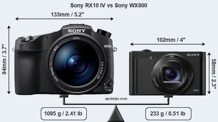 The physical size and weight of the Sony RX10 IV and the Sony WX800 are illustrated in the side-by-side display below. The two cameras are presented according to their relative size. Three consecutive perspectives from the front, the top, and the back are available. All width, height and depth dimensions are rounded to the nearest millimeter.