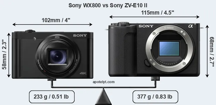 An illustration of the physical size and weight of the Sony WX800 and the Sony ZV-E10 II is provided in the side-by-side display below. The two cameras are presented according to their relative size. Three consecutive views from the front, the top, and the rear side are shown. All width, height and depth measures are rounded to the nearest millimeter.