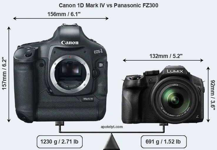 Die physische Größe und das Gewicht der Canon 1D Mark IV und der Panasonic FZ300 werden in der nachfolgenden Graphik illustriert. Die beiden Kameras werden entsprechend ihrer relativen Größe dargestellt. Alle Größenangaben sind auf den nächsten Millimeter gerundet.