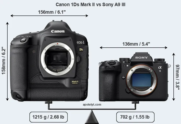 Die physische Größe und das Gewicht der Canon 1Ds Mark II und der Sony A9 III werden in der nachfolgenden Graphik illustriert. Die beiden Kameras werden entsprechend ihrer relativen Größe dargestellt. Alle Größenangaben sind auf den nächsten Millimeter gerundet.
