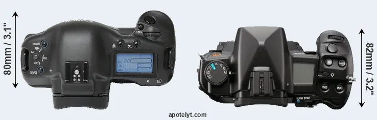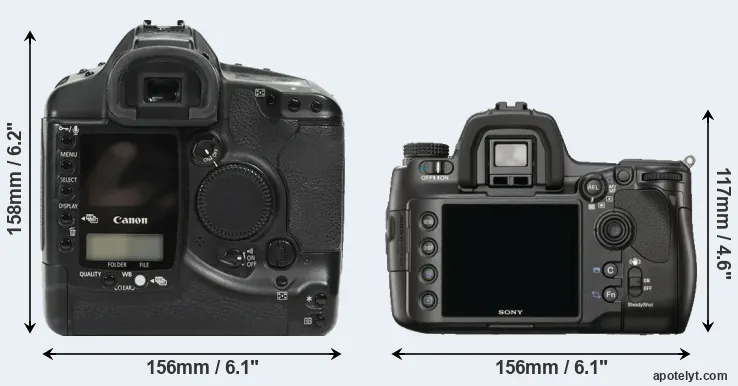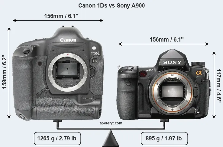 Die physische Größe und das Gewicht der Canon 1Ds und der Sony A900 werden in der nachfolgenden Graphik illustriert. Die beiden Kameras werden entsprechend ihrer relativen Größe dargestellt. Alle Größenangaben sind auf den nächsten Millimeter gerundet.