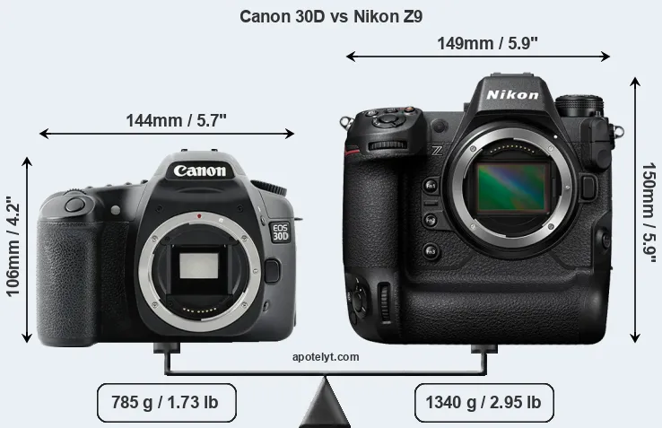 Die physische Größe und das Gewicht der Canon 30D und der Nikon Z9 werden in der nachfolgenden Graphik illustriert. Die beiden Kameras werden entsprechend ihrer relativen Größe dargestellt. Alle Größenangaben sind auf den nächsten Millimeter gerundet.