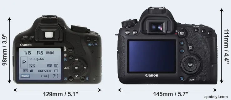 Die physische Größe und das Gewicht der Canon 500D und der Canon 6D werden in der nachfolgenden Graphik illustriert. Die beiden Kameras werden entsprechend ihrer relativen Größe dargestellt. Alle Größenangaben sind auf den nächsten Millimeter gerundet.