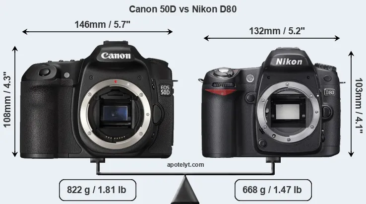 Die physische Größe und das Gewicht der Canon 50D und der Nikon D80 werden in der nachfolgenden Graphik illustriert. Die beiden Kameras werden entsprechend ihrer relativen Größe dargestellt. Alle Größenangaben sind auf den nächsten Millimeter gerundet.
